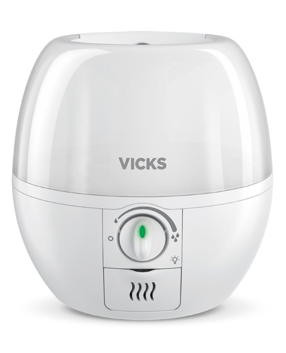 Designed for small rooms, this 0.6-gallon humidifier has adjustable mist control to regulate the humidity level. The humidifier can operate for up to 24 hours on the lowest setting, and automatically shuts off when the tank is empty. This Vicks Cool Mist Humidifier utilizes Ultrasonic Technology for whisper-quiet operation that won't disturb sleep, and it has an optional colour changing nightlight. Cycle through the 7 colours or stop on your favourite - it's up to you! The 3-in-1 is easy to operate, with no filters to replace. Provide the comforting scent of Vicks anytime by adding a Vicks VapoPad or your favourite essential oil.